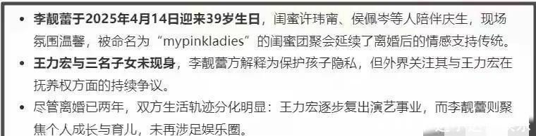 现在王力宏的事业慢慢回了正轨,巡回演唱会开得风生水起,上海场时还把疑似孩子画的画投到大屏幕上,隔着千里传递思念,李靓蕾也渐渐走出阴霾,偶尔和好友聚会,还会关注儿童保护的公益事业。